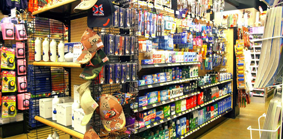 Cold drinks, sunscreens, hats, souvenirs of the Ozarks, gum, aspirin, film, crazy gifts, nasal spray, socks, post cards, cold remedies, candy, juices, desk and laundry supplies, lipsticks, tee-shirts, condiments, totes, crayons, hair spray and loads of the latest, cool sunglasses.